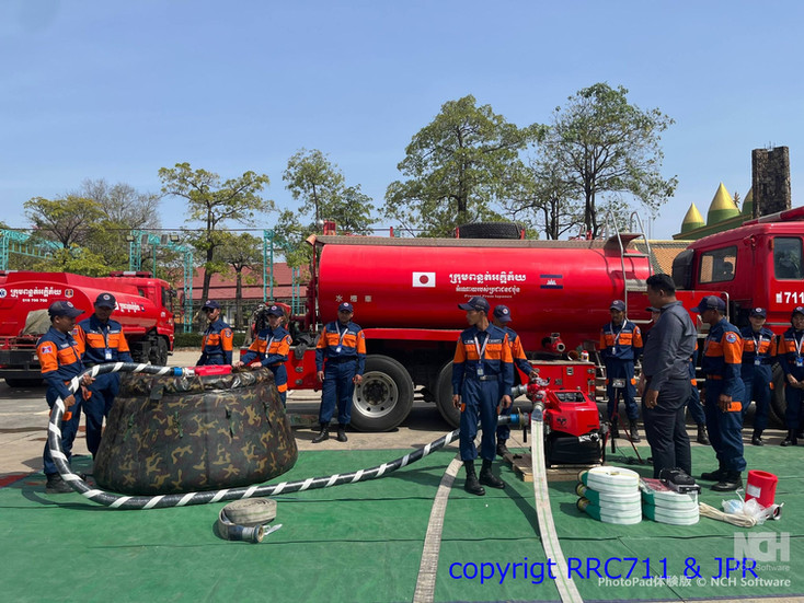トーハツ(株)海外事業部の青山氏らは、当会名誉理事長の正井潔氏と調整の上、機材を引渡し式をカンボジア内務省消防救助局で行い、その後機材の使用方法を指導を行なって頂きました。